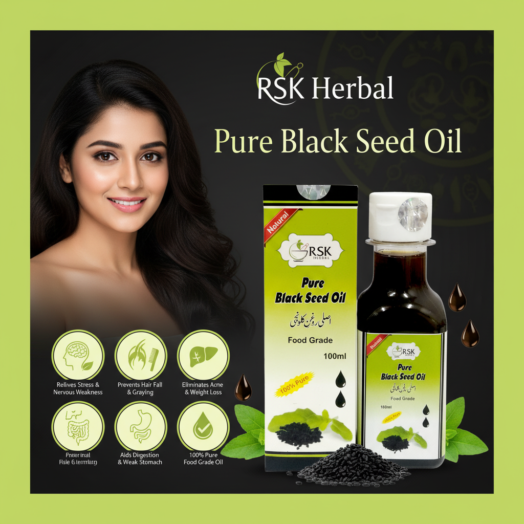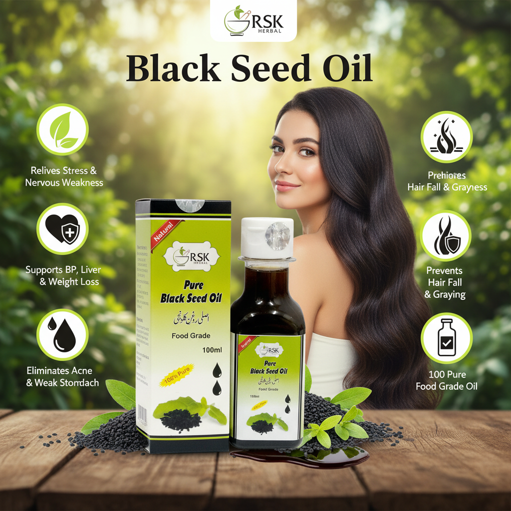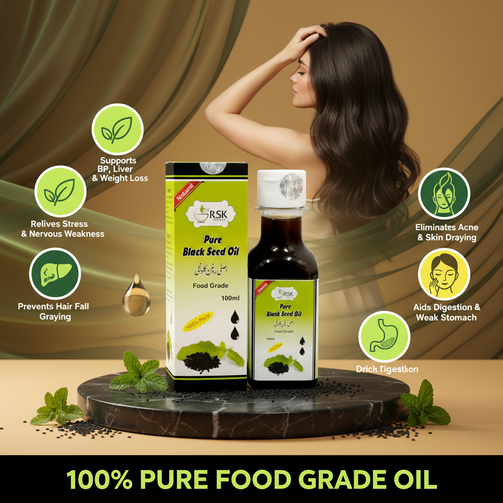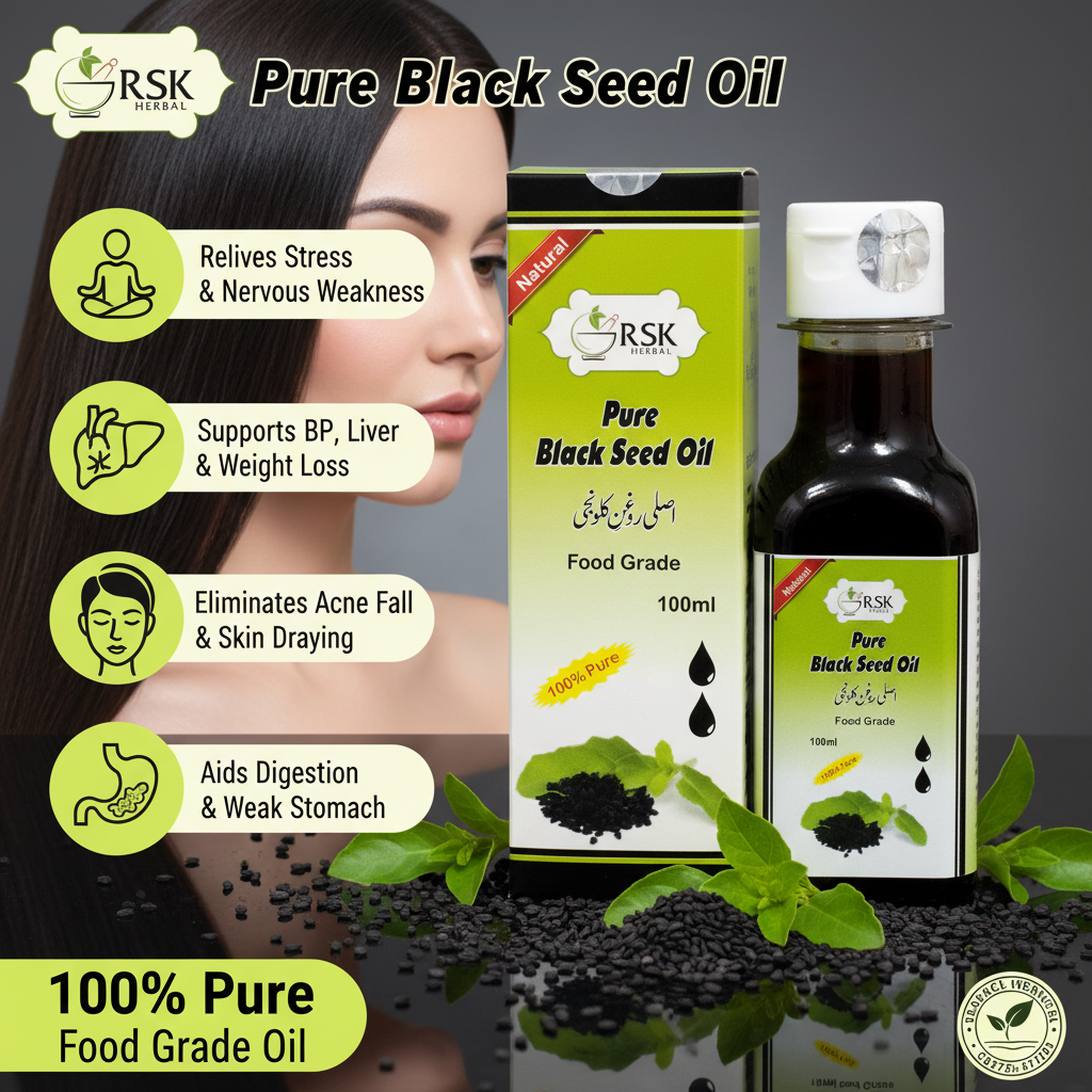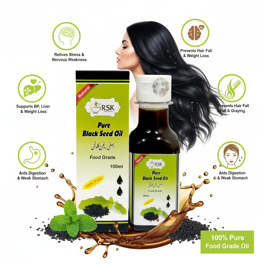 Black Seed Oil, also known as Kalonji Oil, is a time-honored Ayurvedic and Unani herbal oil valued for its holistic wellness properties. When used as part of a balanced routine, it helps support nervous strength, digestive comfort, and metabolic balance.