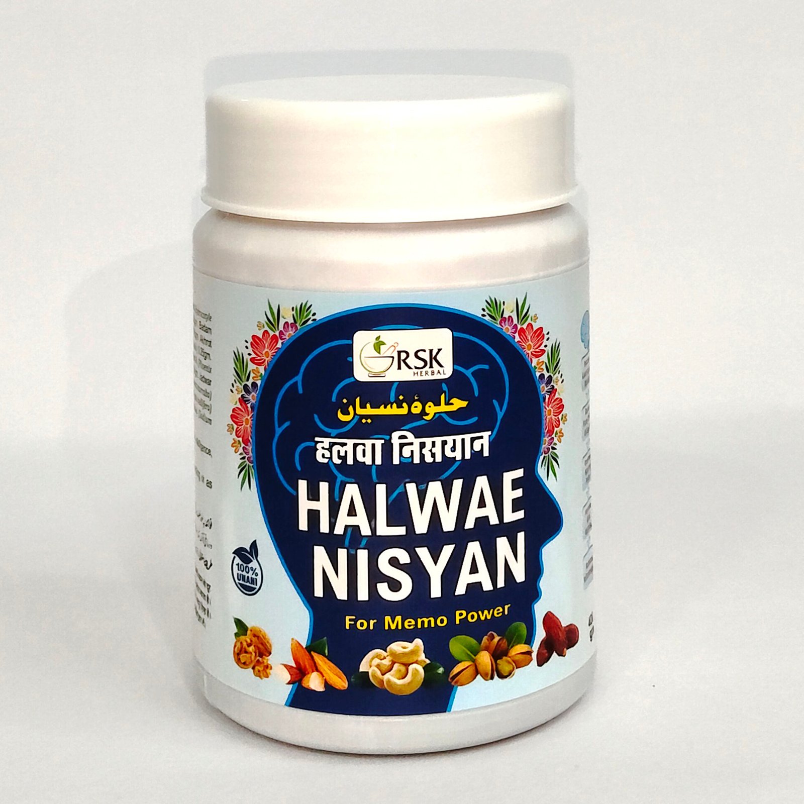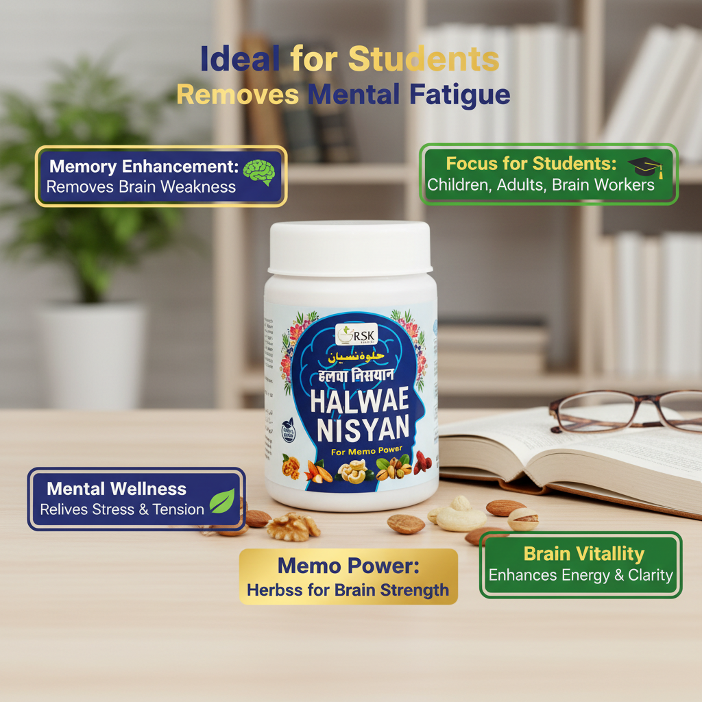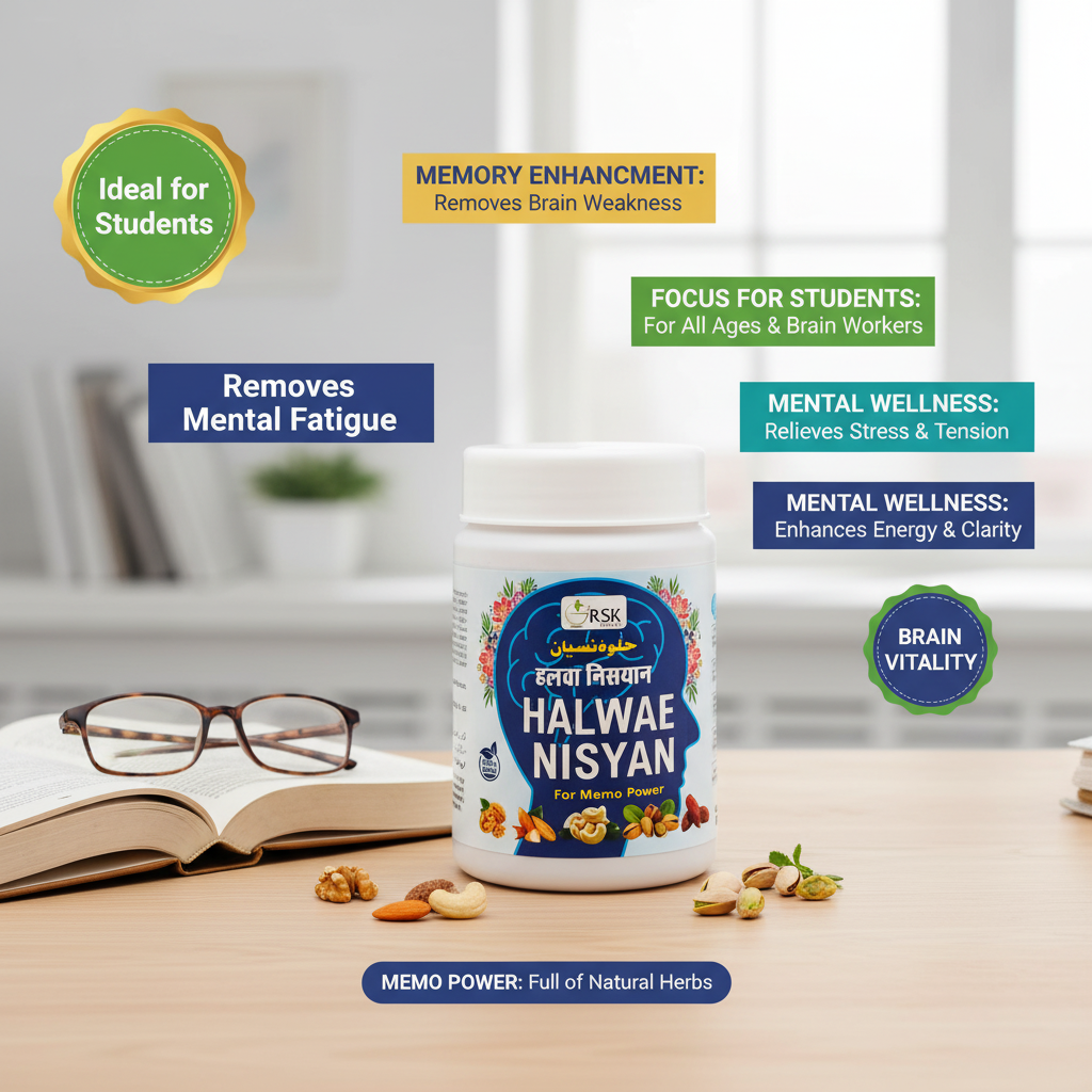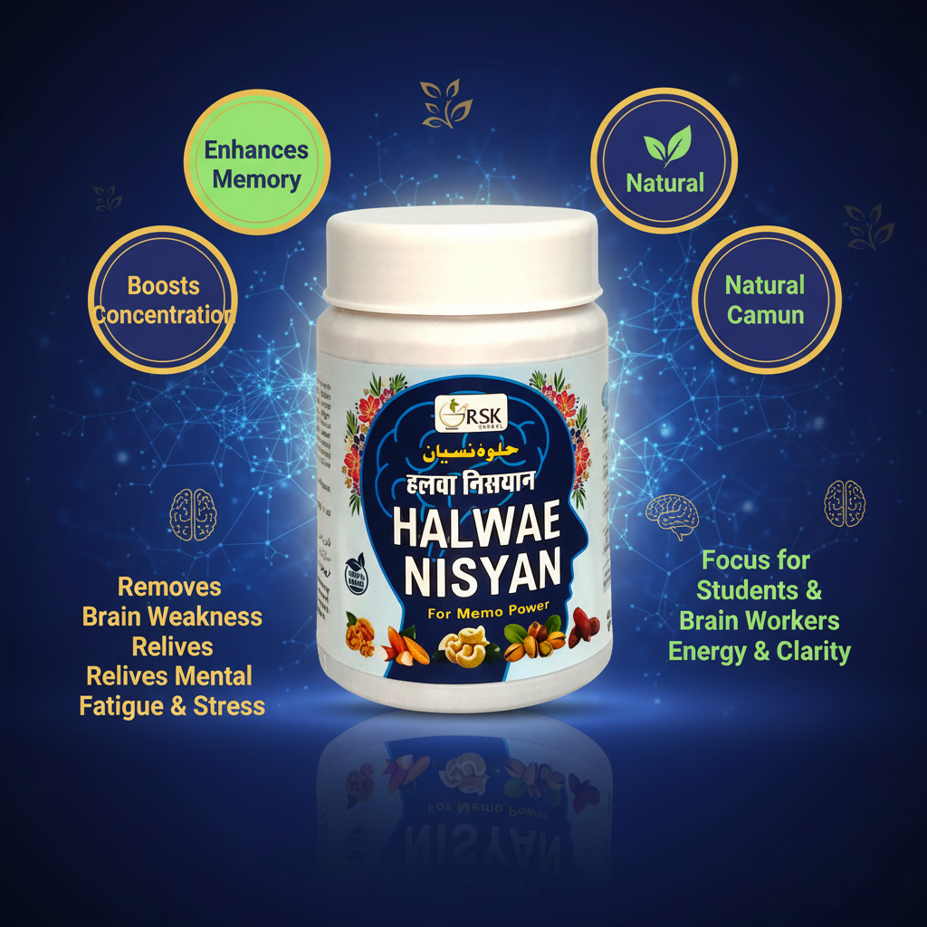 Halwae Nisyan is a well-known Ayurvedic and Unani herbal formulation prepared in paste form and traditionally used to support brain health and mental performance. It is valued for its role in enhancing intellect, improving memory power, and supporting overall cognitive strength.